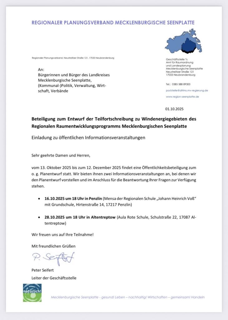 Pressemitteilungen Beteiligung zum Entwurf der Teilfortschreibung zu Windenergiegebieten des regionalen Raumentwicklungsprogramms MSE 27. Oktober 2025 admin 60 Aufrufe